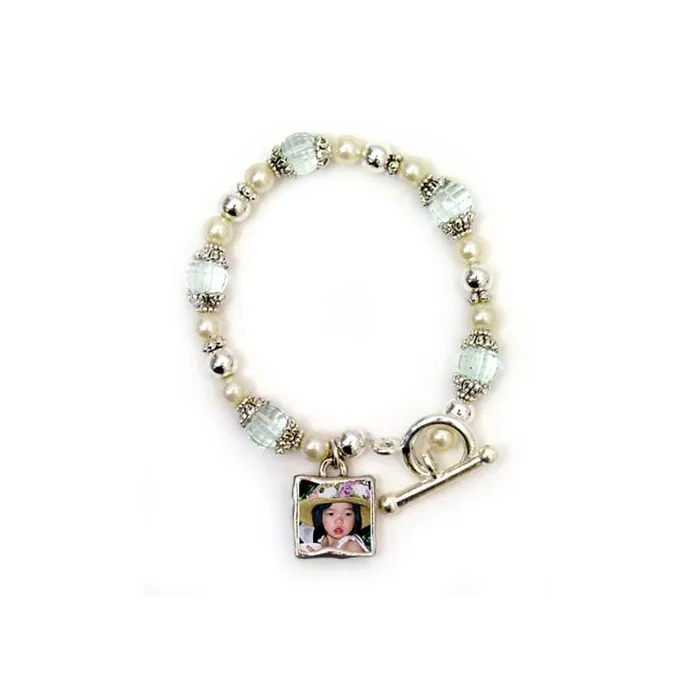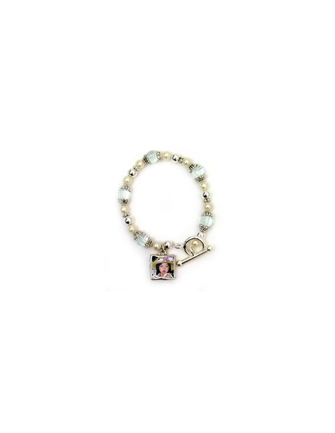 Brazalete elástico con perlas y cuerdas de cristal, con un colgante marco foto personalizable por las dos caras. Cierre de palanca.