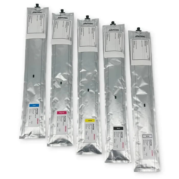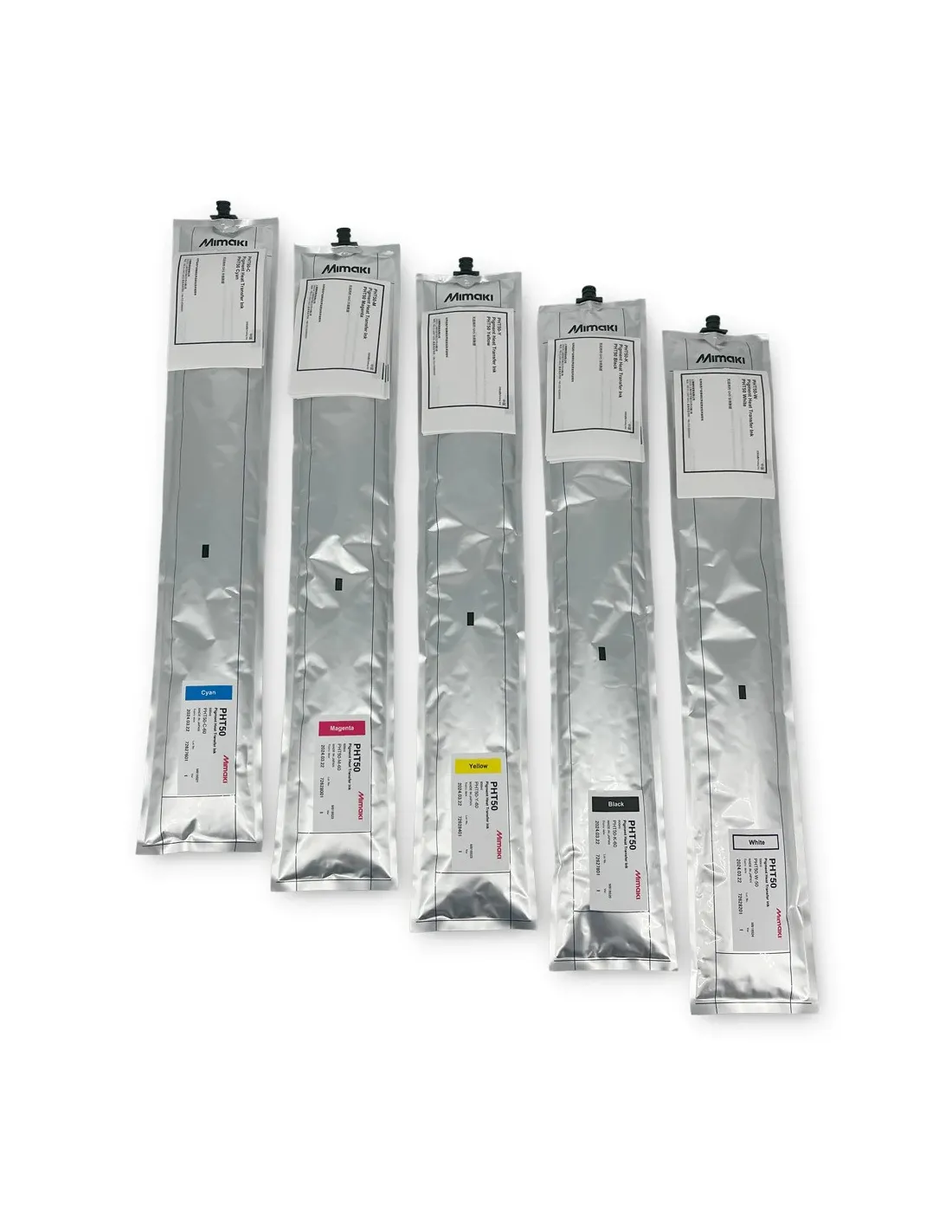 Tinta Mimaki PHT50, es dedicada para imprimir directamente en una película específica de DTF, luego en polvo de fusión en caliente y tratada térmicamente para crear una capa de hoja para la transferencia.