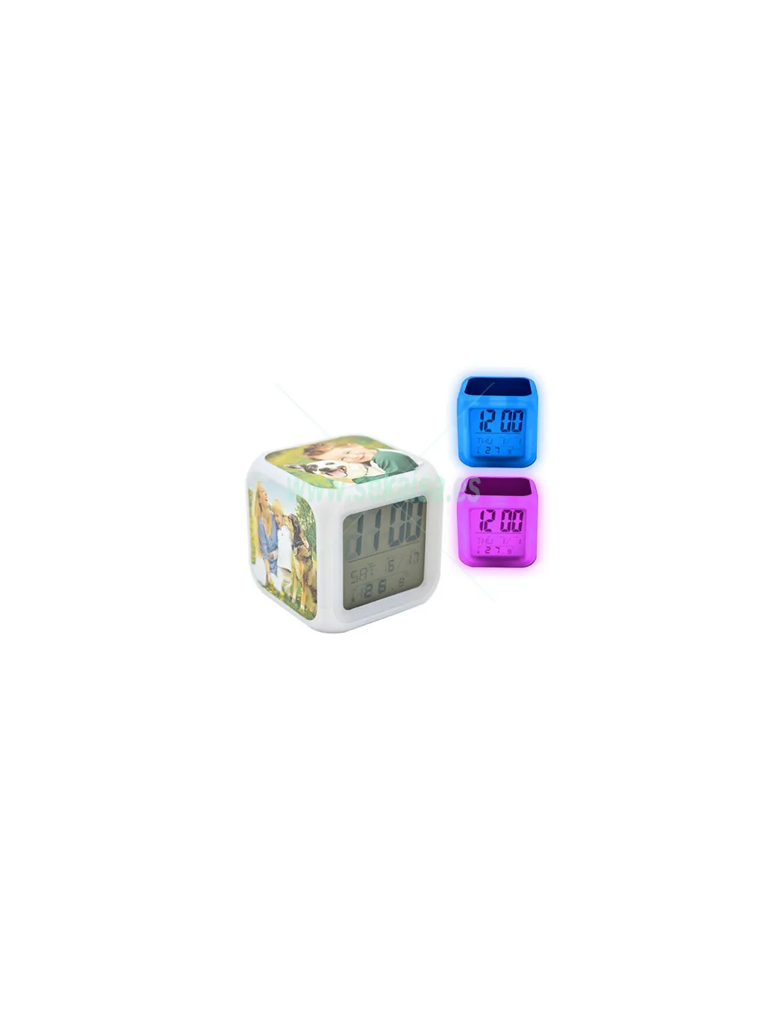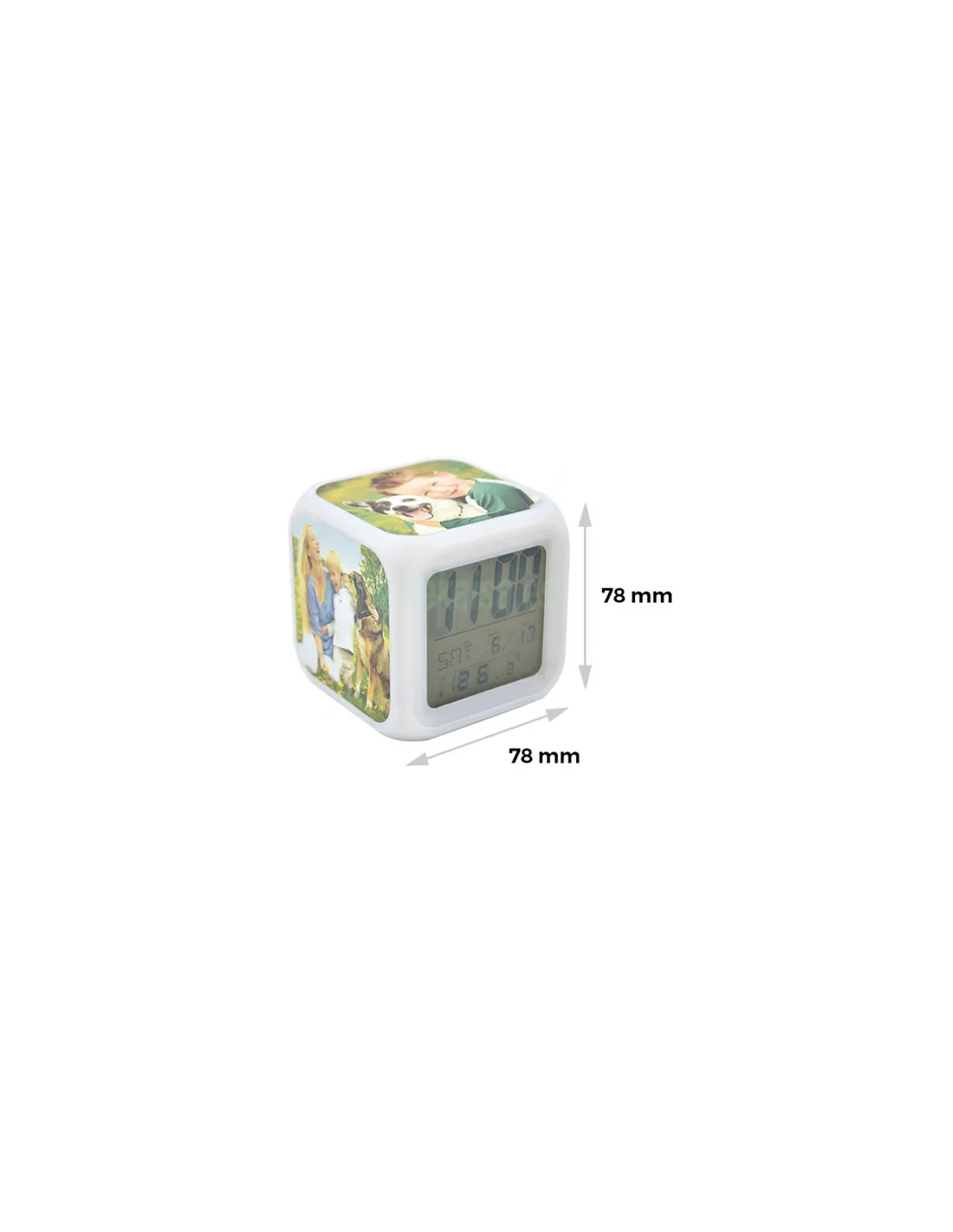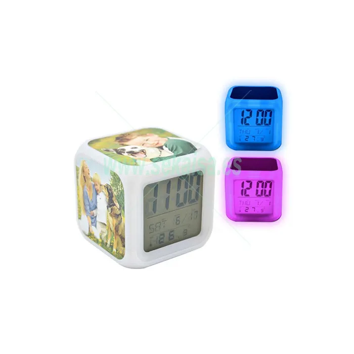 Reloj-despertador digital cúbico con placas sublimables.