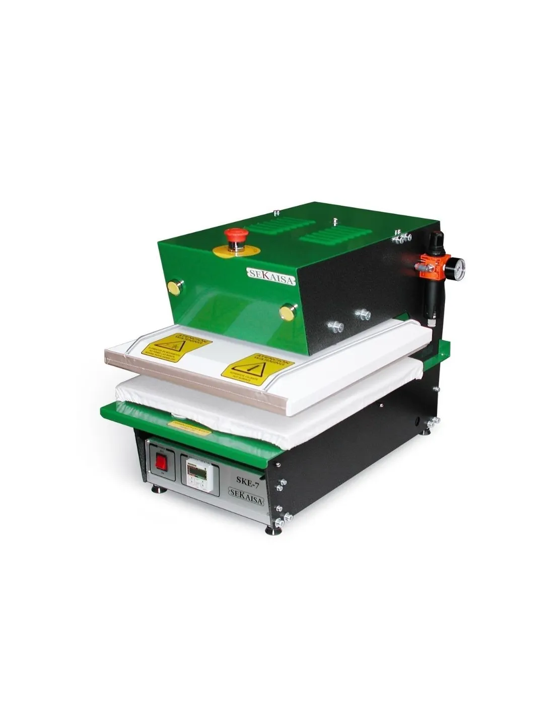 El modelo SKE-7, tanto en su versión manual como automática, permite realizar estampaciones de alta presión con papel de transfer, vinilo textil o fotocopias.