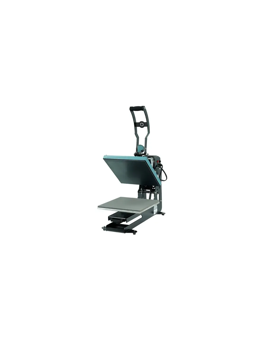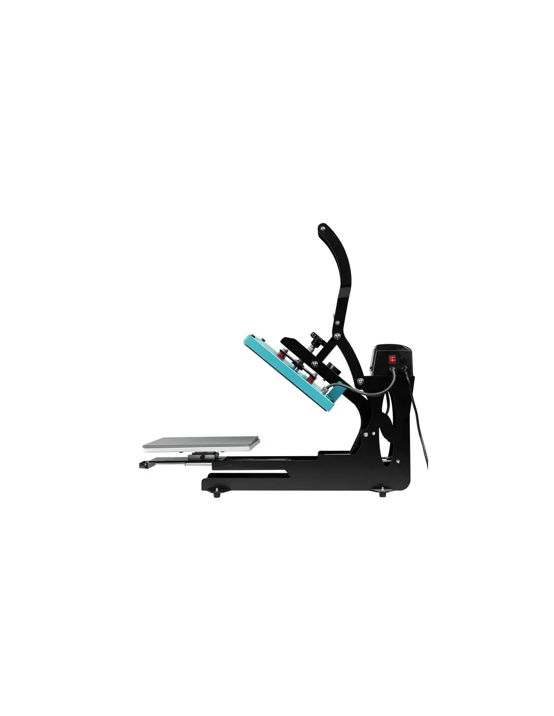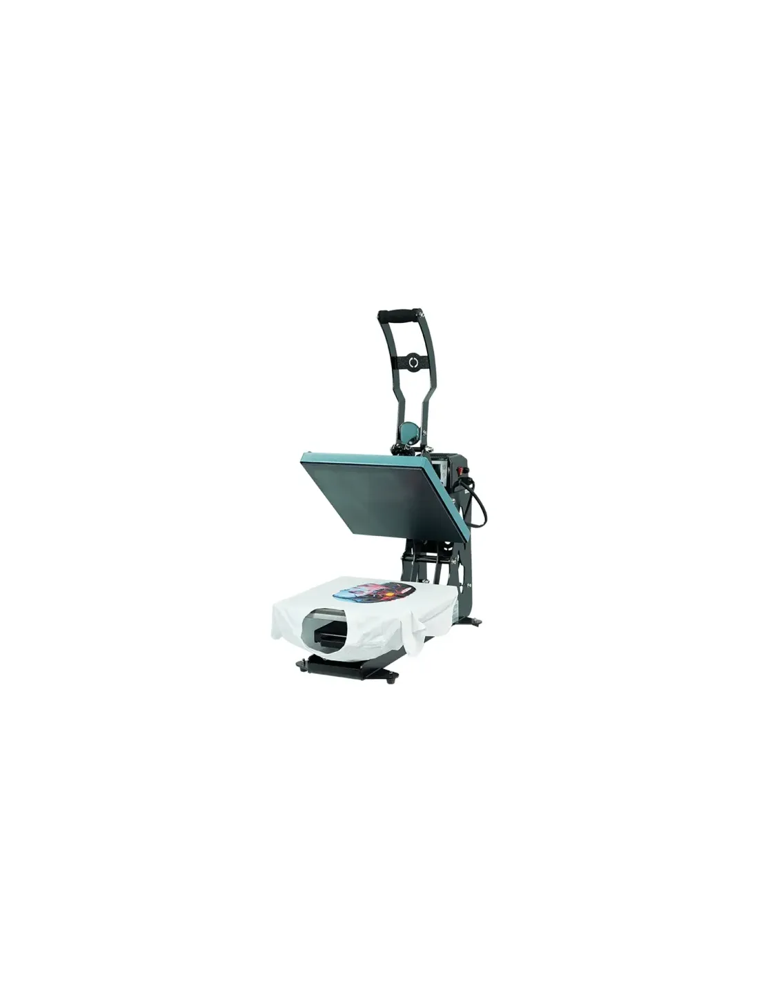 Su plato inferior se desliza hacia afuera para mejorar la comodidad y la seguridad del operador, mientras que su diseño permite vestir la plancha transfer facilitando la impresión de camisetas y otras prendas.