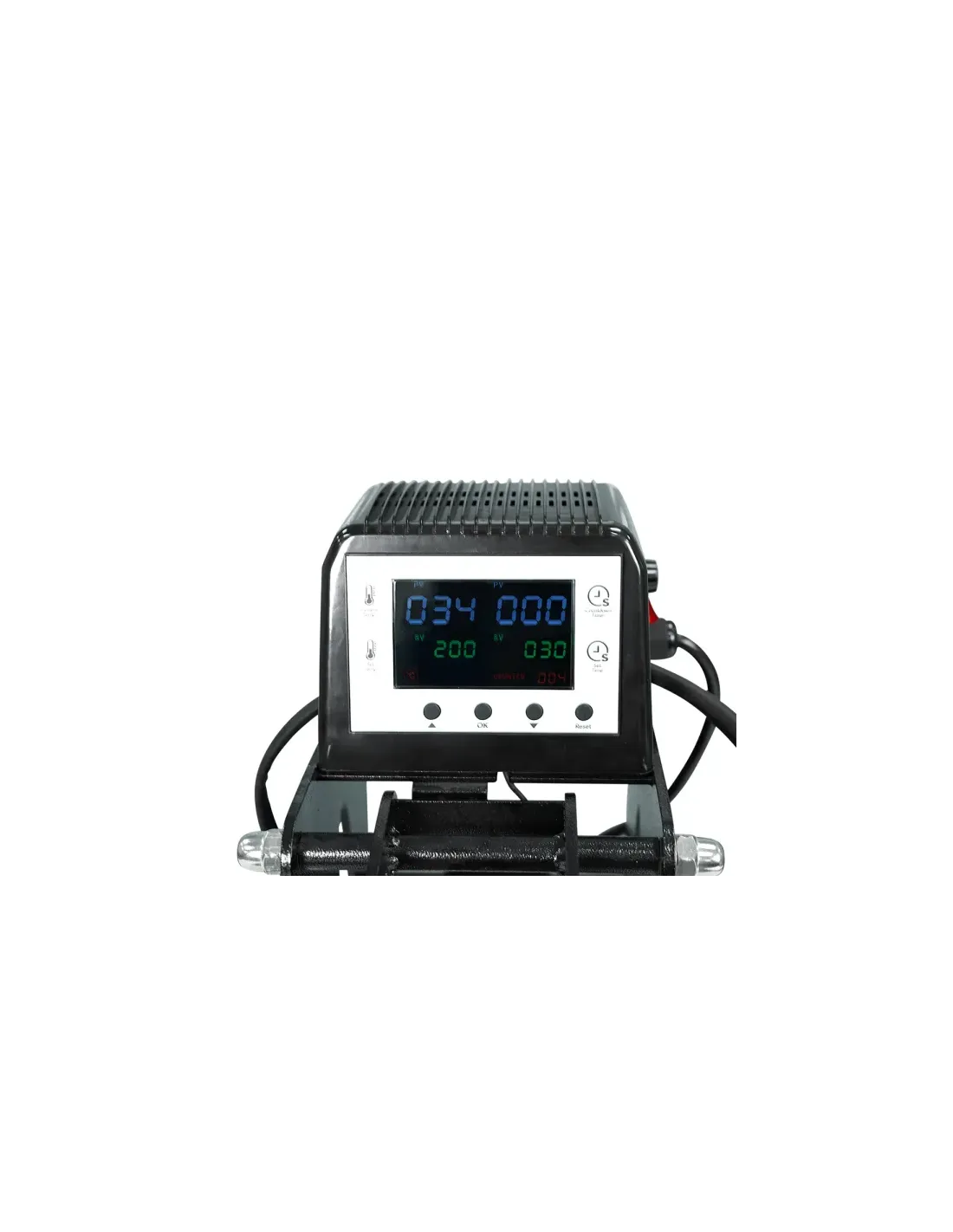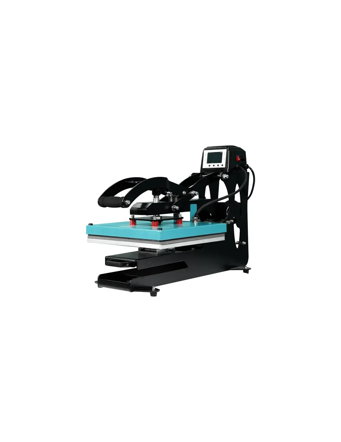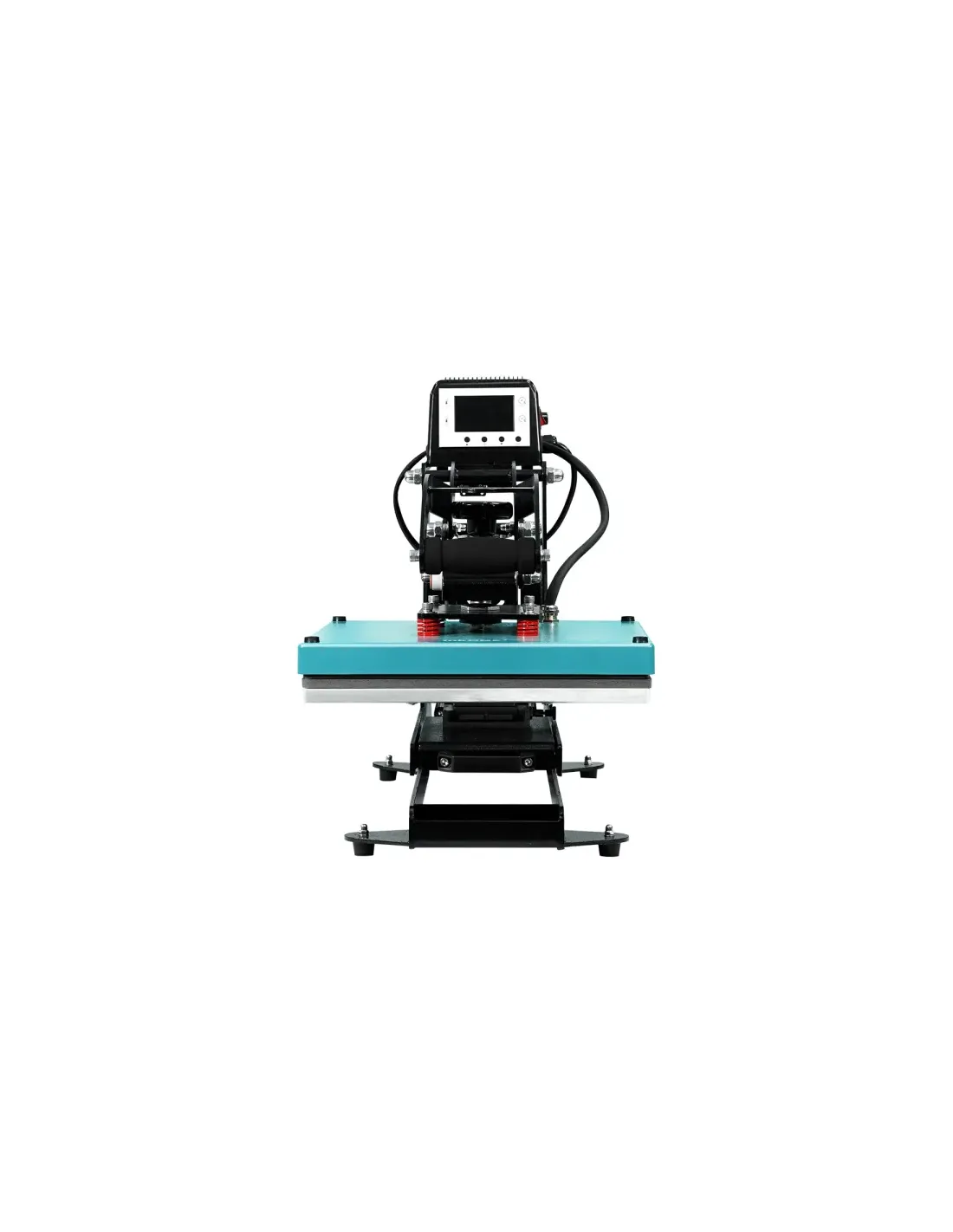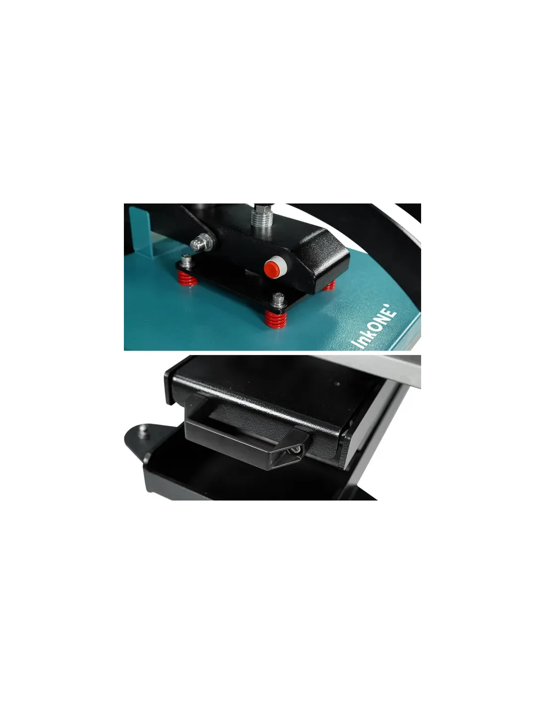 Su plato inferior se desliza hacia afuera para mejorar la comodidad y la seguridad del operador, mientras que su diseño permite vestir la plancha transfer facilitando la impresión de camisetas y otras prendas.