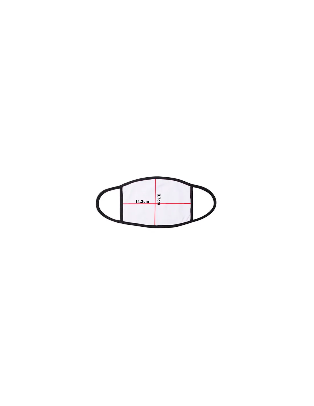 Máscara pequena sublimável, adequada para personalização através da técnica de sublimação, com borda preta.