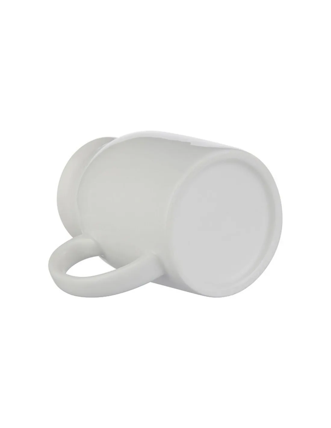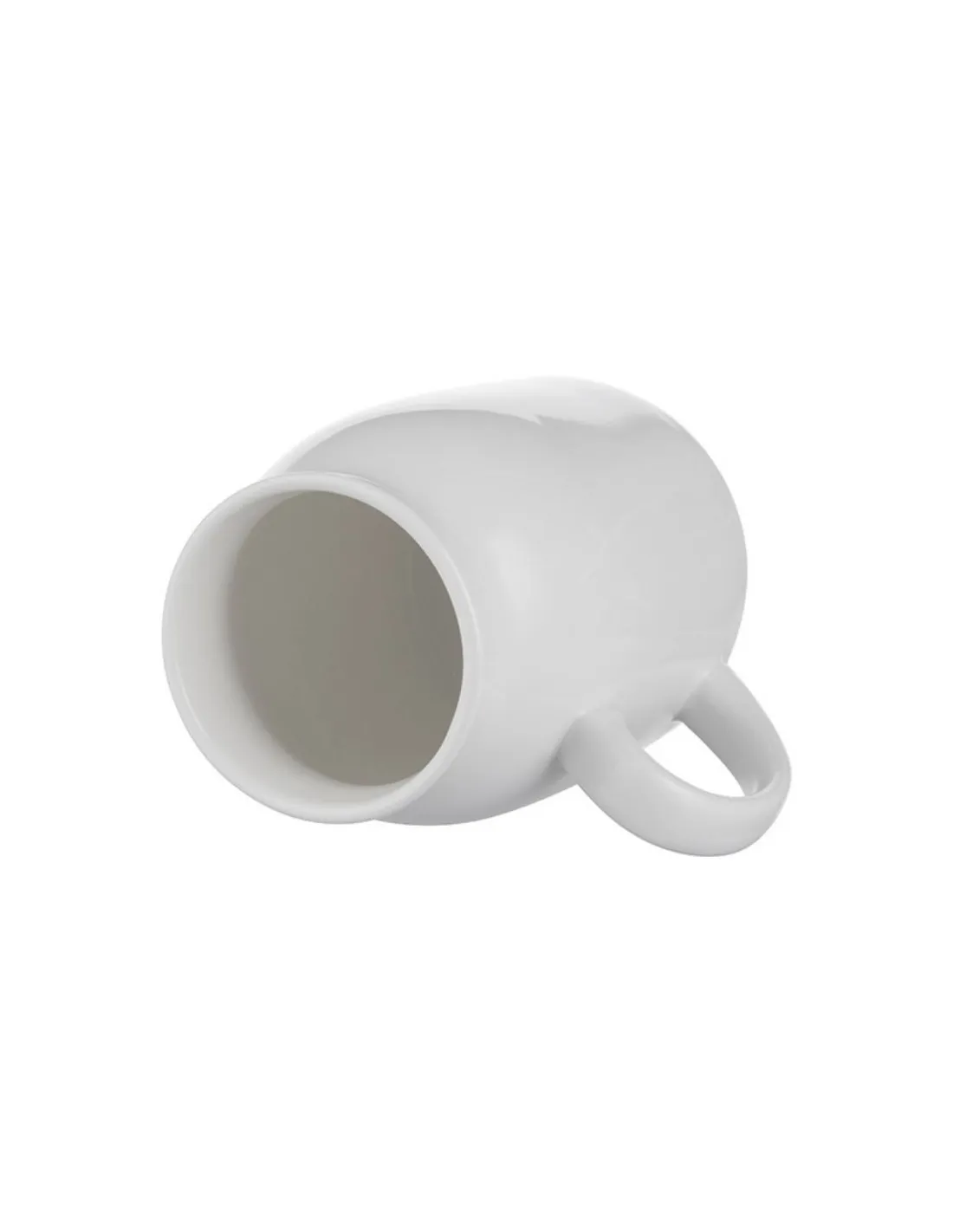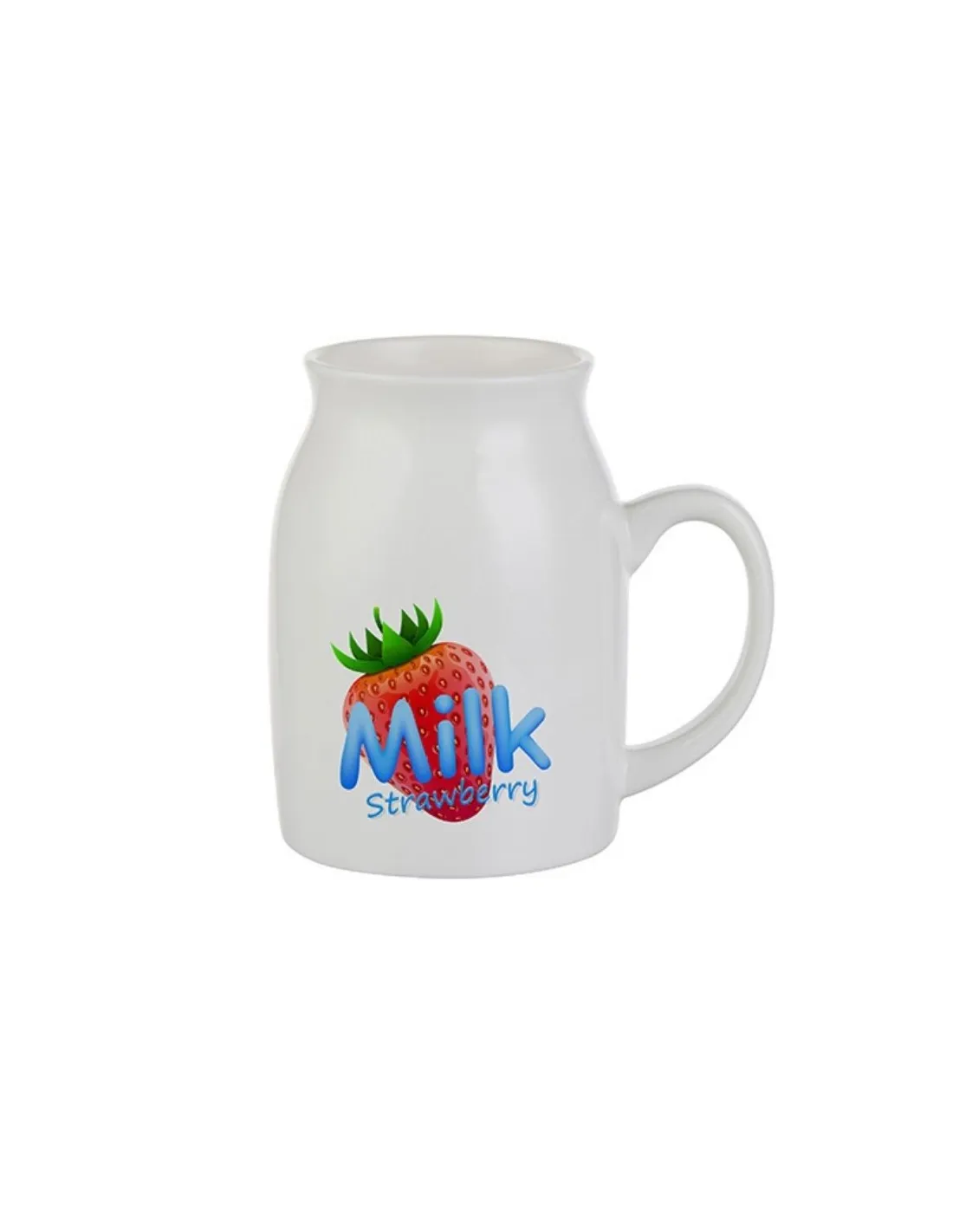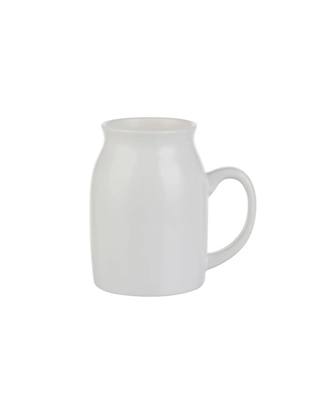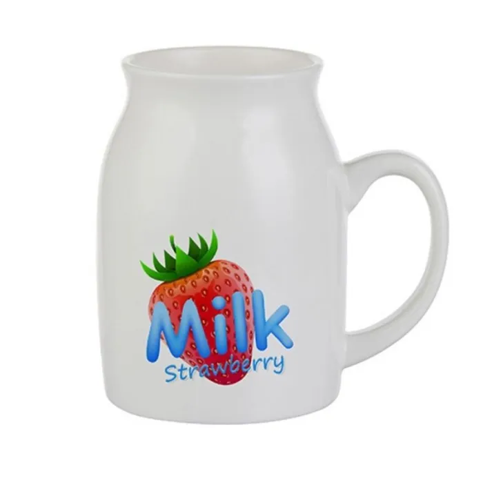 Caneca de cerâmica branca em formato de lata de leite, personalizável através da técnica de sublimação.