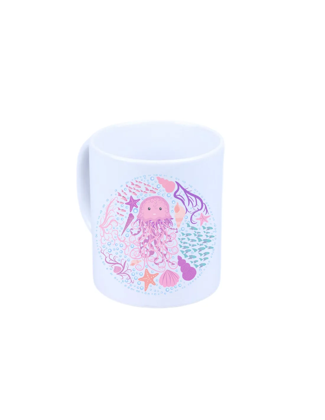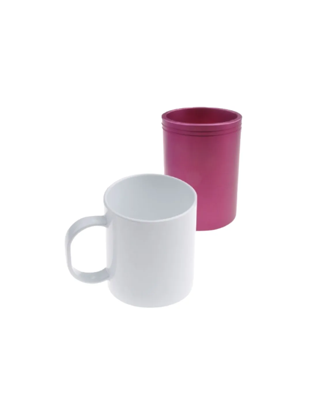 Caneca de plástico personalizável utilizando a técnica de sublimação.