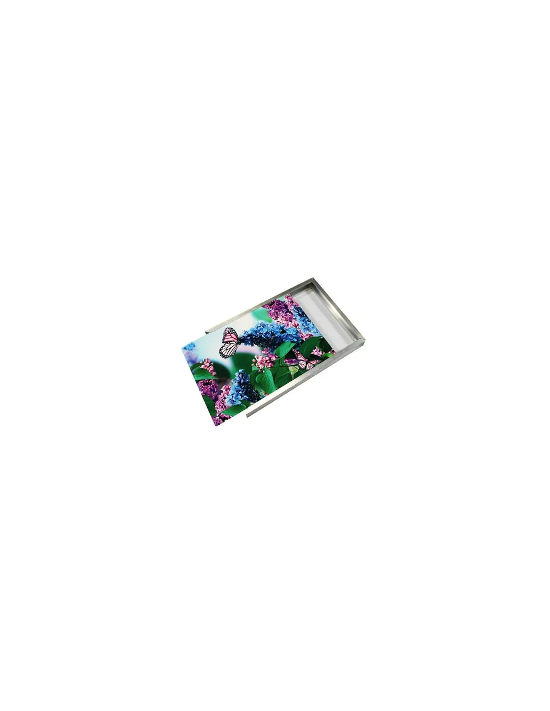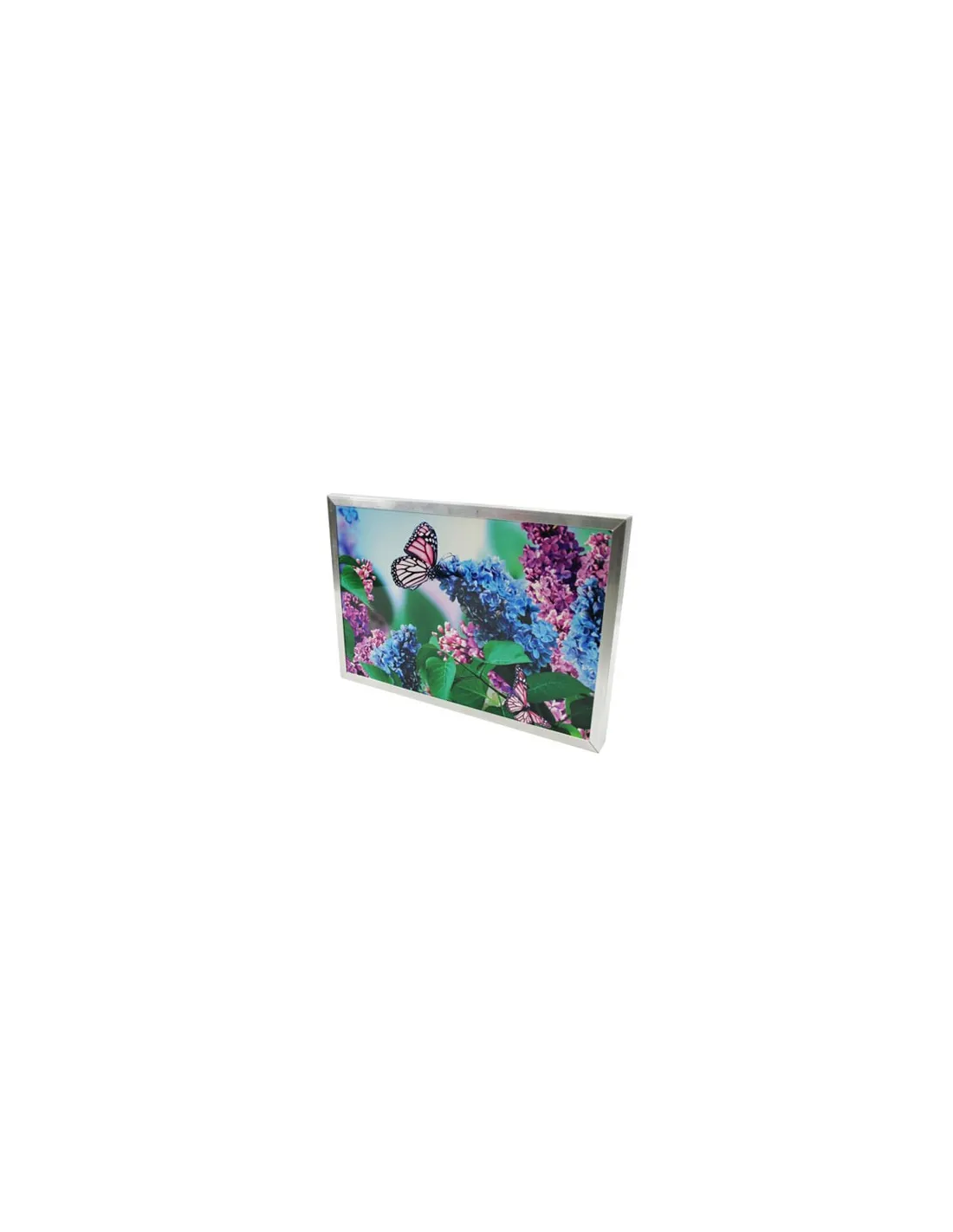 Nossas molduras de alumínio prateadas contrastam com as cores vibrantes das fotografias nos painéis.