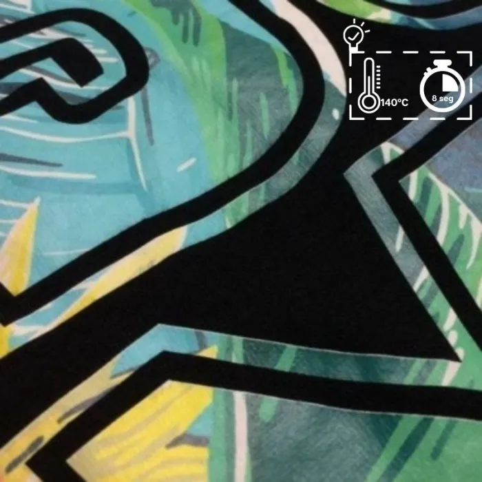 | Algodão, poliéster, mistura de algodão e poliéster, "tecidos técnicos" ou elastano, sem tratamento de sublimação. |