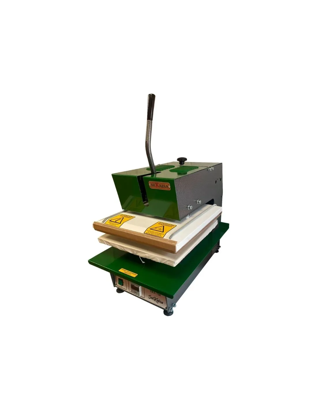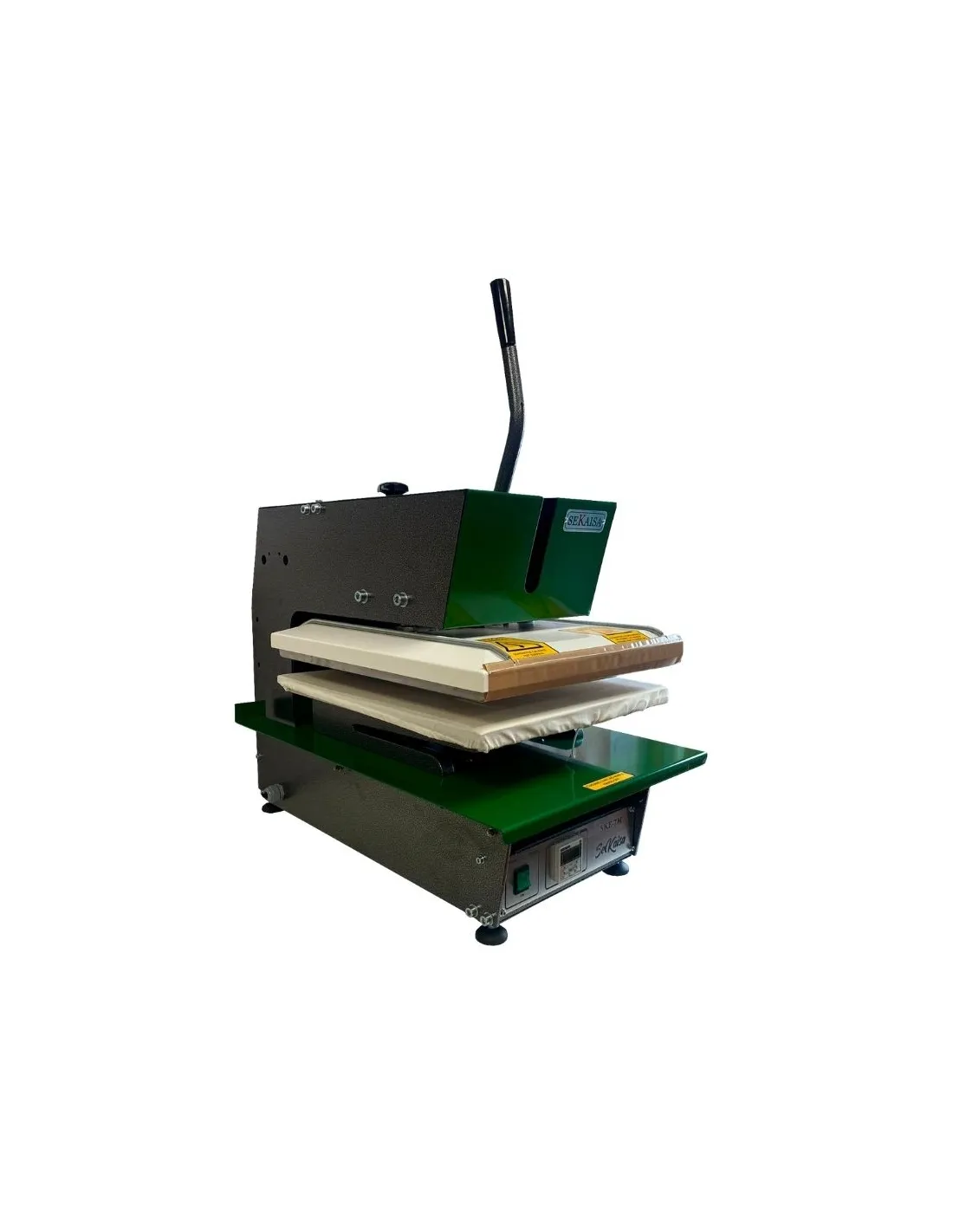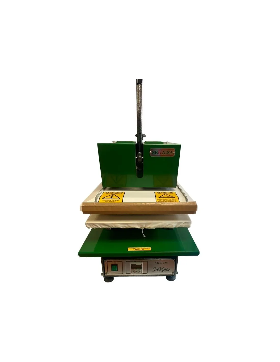 O modelo SKE-7, tanto na versão manual quanto na automática, permite impressão de alta pressão com papel de transferência, vinil têxtil ou fotocópias.