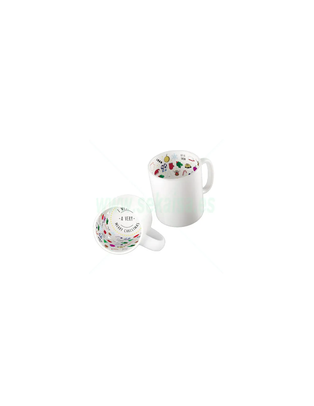 Taza de cerámica extra blanca con interior sublimado con motivos navideños.